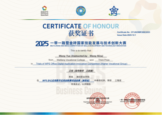 我院始终秉持“以就业为导向、以能力为核心”的育人理念,高度重视学生信息技术与办公实务技能的培养。此次获奖,既体现了学生运用现代化办公工具解决实际问题的职业能力,也反映了课程教学与岗位需求的紧密对接。学院将继续鼓励学生参与高水平技能竞赛,深化“赛教融合、以赛促练”的教学改革,切实提升学生职业竞争力,为培养适应数字经济发展的高素质技能人才夯实基础。(房晓宇 付晓佳 供稿)